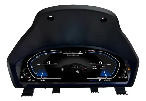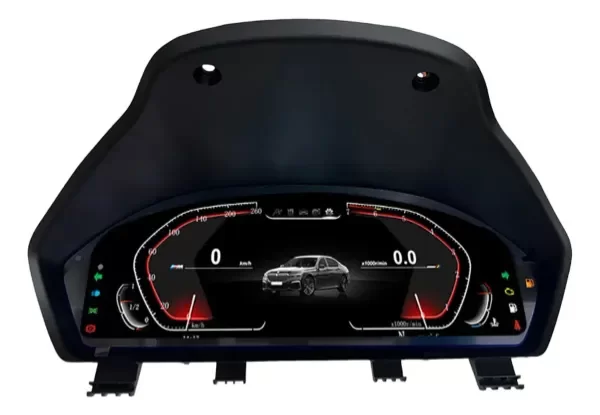 Tablero digital tipo Virtual Cockpit compatible con BMW modelos X1, X2, X3, X4 y X5 años 2017 a 2025. Diseñado para renovar el interior del vehículo con una estética moderna y deportiva, ofrece una pantalla de alta definición que muestra información clara y configurable como velocidad, RPM, consumo, navegación y datos del vehículo.